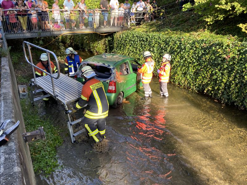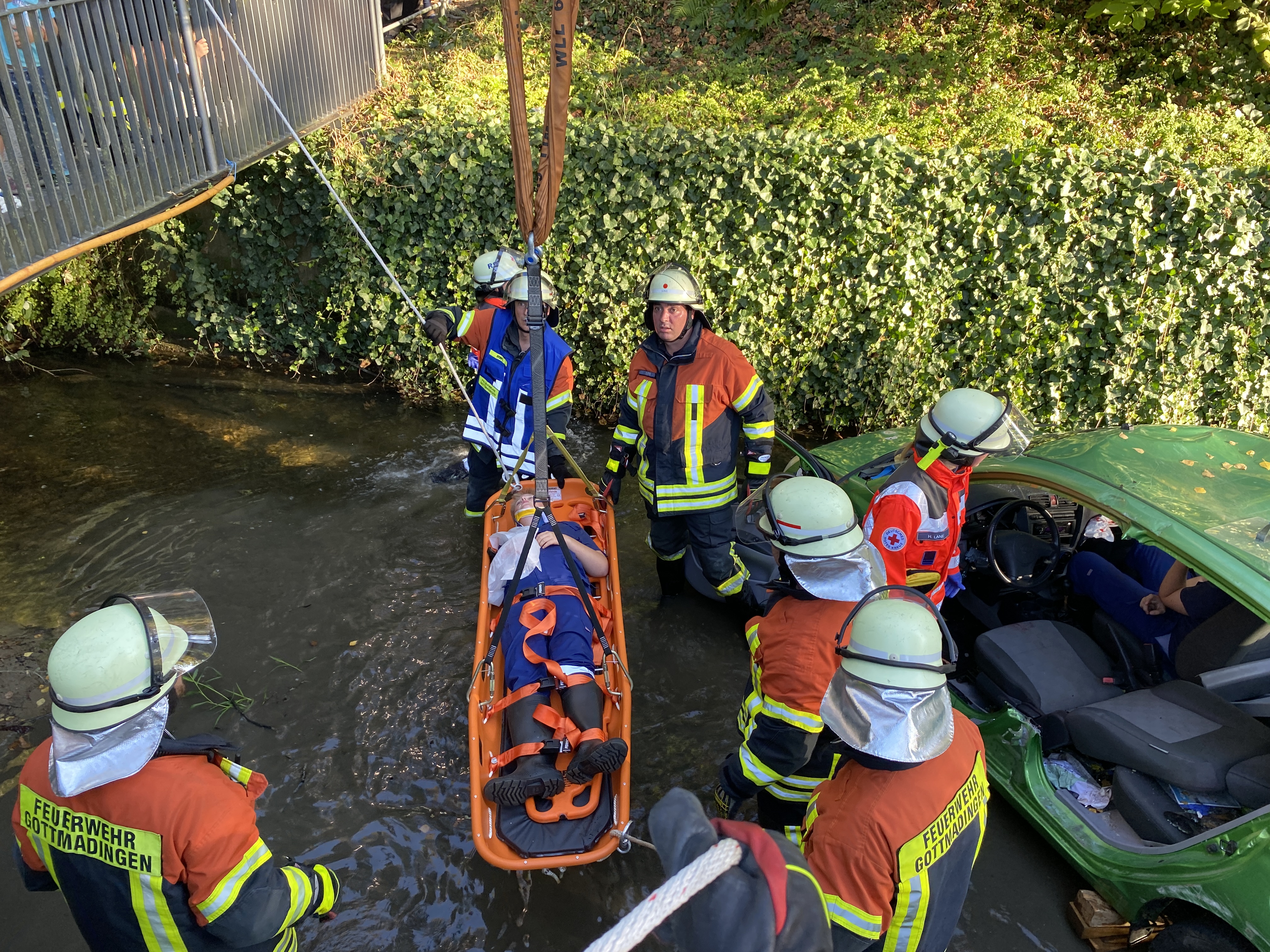 Als letzte Station wurde ein Verkehrsunfall gemeldet. Das Auto lag im Bachbett. Der Rüstzug bestehend aus dem Einsatzleiter mit dem Vorrausfahrzeug (MZF), ein Rüstwagen (RW1) sowie das Hilfeleistungslöschfahrzeug (HLF20) rückten an. 2 Personen galt es zu befreien. Mit viel Know-How wurden die Insassen gerettet und über die Drehleiter schonen aus dem tiefer liegenden Bach gerettet. Der DRK Ortsverein Gottmadingen war ebenfalls bei mehreren Stationen dabei und zeigte sein Können bei der Betreuung und Erstversorgung der durch die Jugendfeuerwehr gestellten Verletzten.